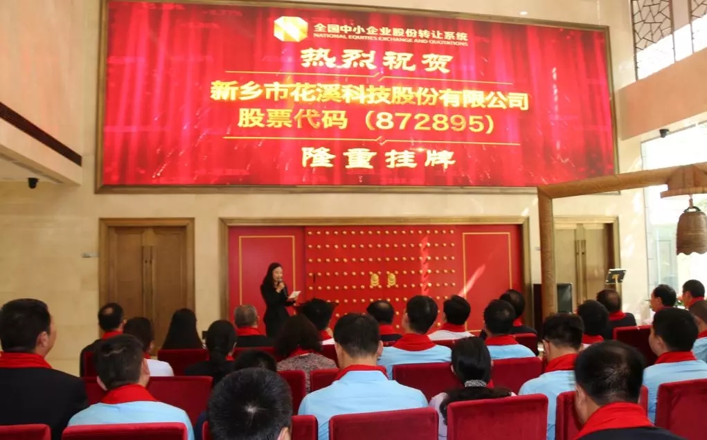 2018年8月31日上午9:30時(shí),新鄉(xiāng)市花溪科技股份有限公司(簡稱:花溪科技,股票代碼:872895)新三板掛牌敲鐘儀式在北京全國中小企業(yè)股份轉(zhuǎn)讓系統(tǒng)成功舉行。中國農(nóng)機(jī)工業(yè)協(xié)會(huì)副秘書長寧學(xué)貴、獲嘉縣人民政府縣長劉軍偉、新鄉(xiāng)市金融局副局長張延明等特邀嘉賓及公司股東代表、員工代表、主辦券商、律師事務(wù)所、會(huì)計(jì)師事務(wù)所代表共同出席了掛牌儀式,共同見證花溪科技這一里程碑式的重要時(shí)刻。